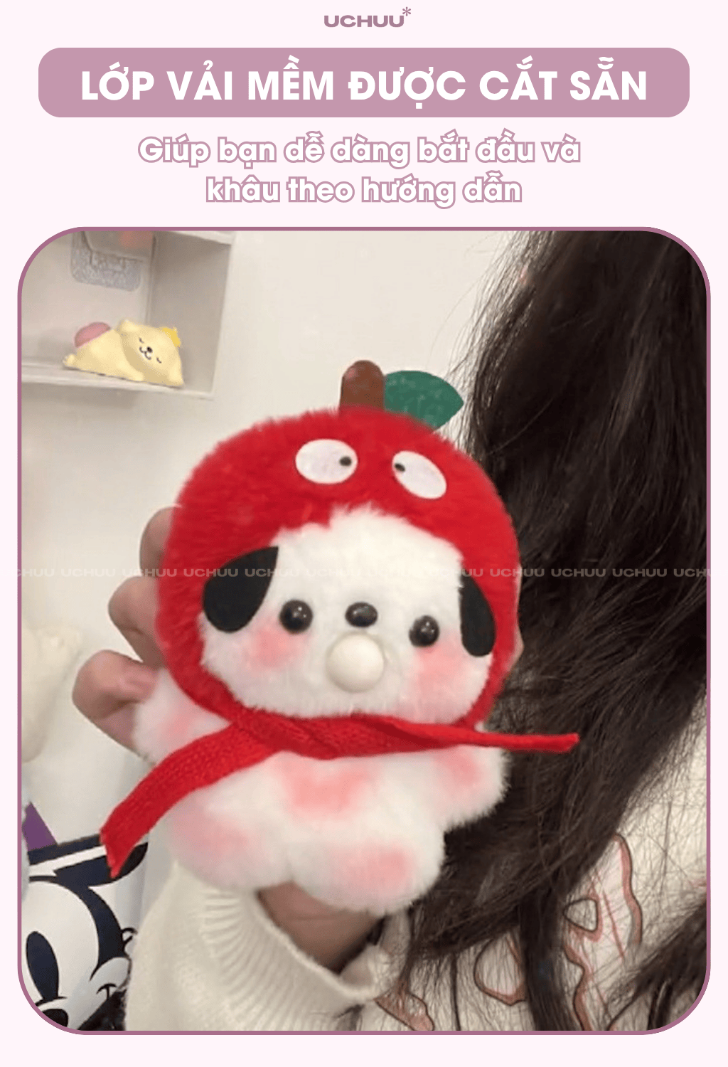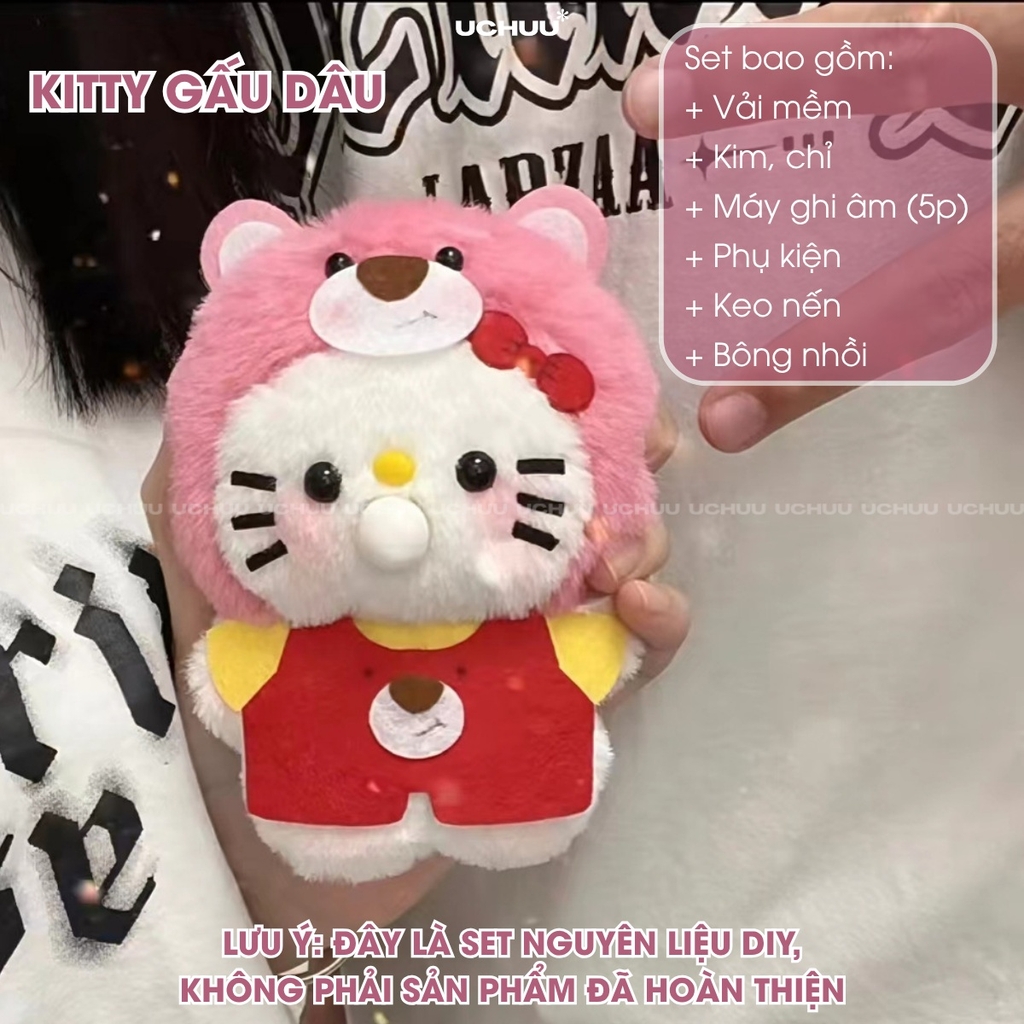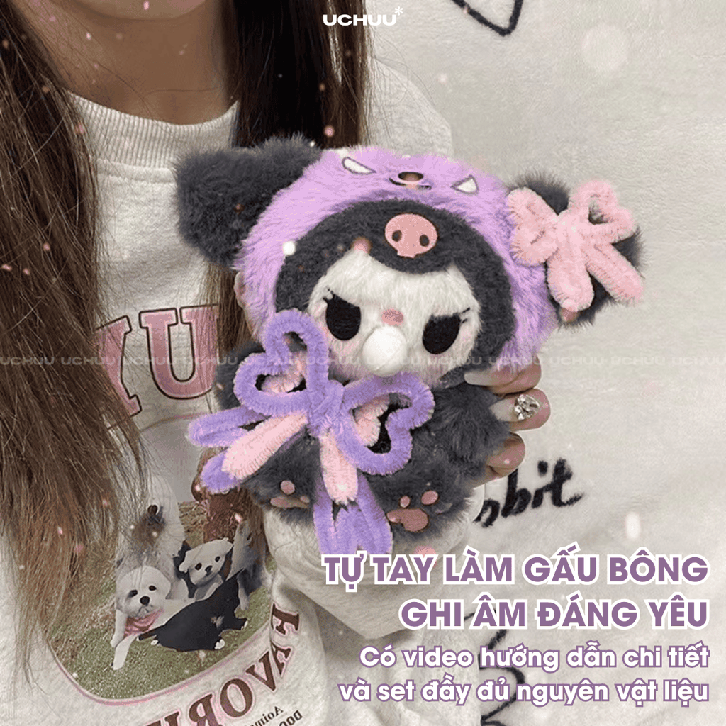 1. Set nguyên vật liệu đầy đủ gồm vải mềm, kim chỉ, keo nến, bông nhồi, bộ ghi âm 5 phút và các phụ kiện trang trí kèm dây móc xích tiện treo balo, túi xách hoặc chìa khóa.