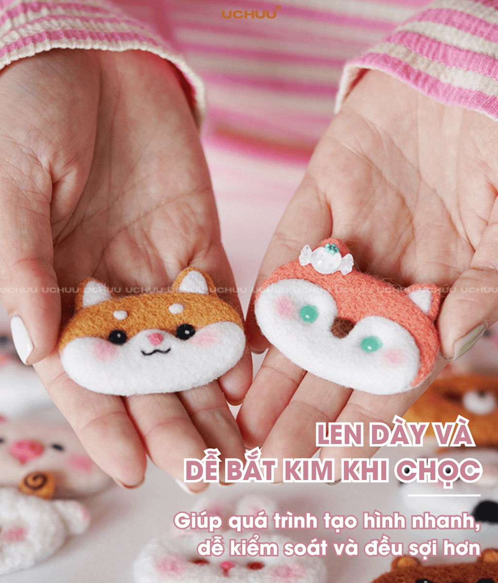 - Mỗi set gồm: len, kim chọc len, đệm xốp, khuôn mẫu, mắt, kẹp, keo nến