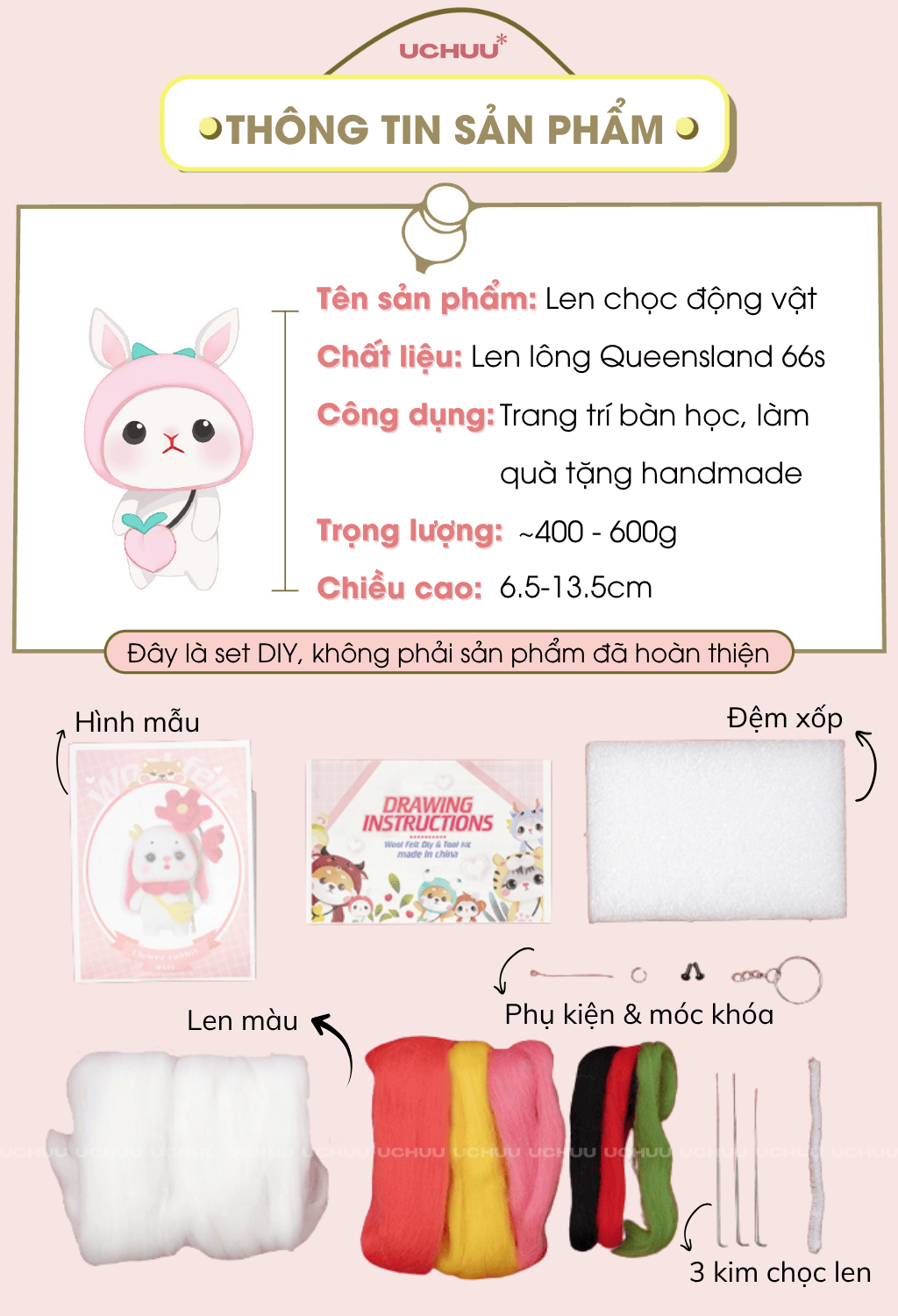 - Mỗi set gồm: len màu, kim chọc len, đệm xốp, phụ kiện, móc khóa