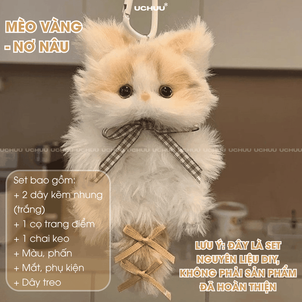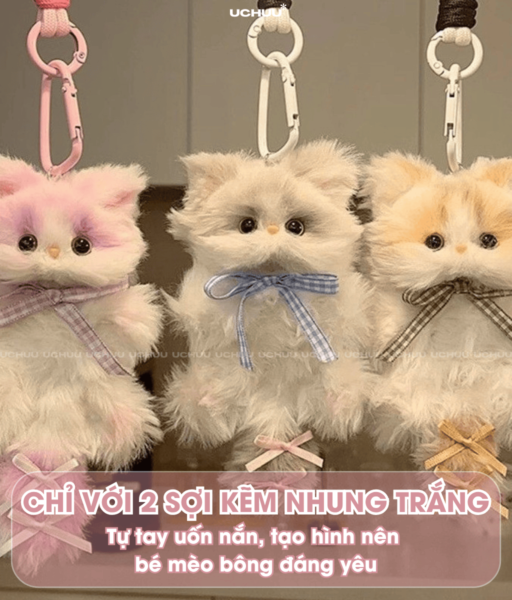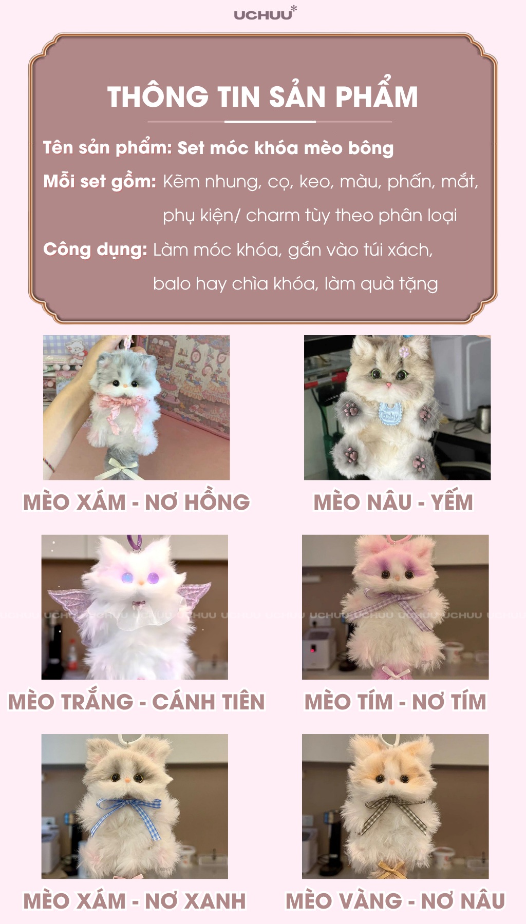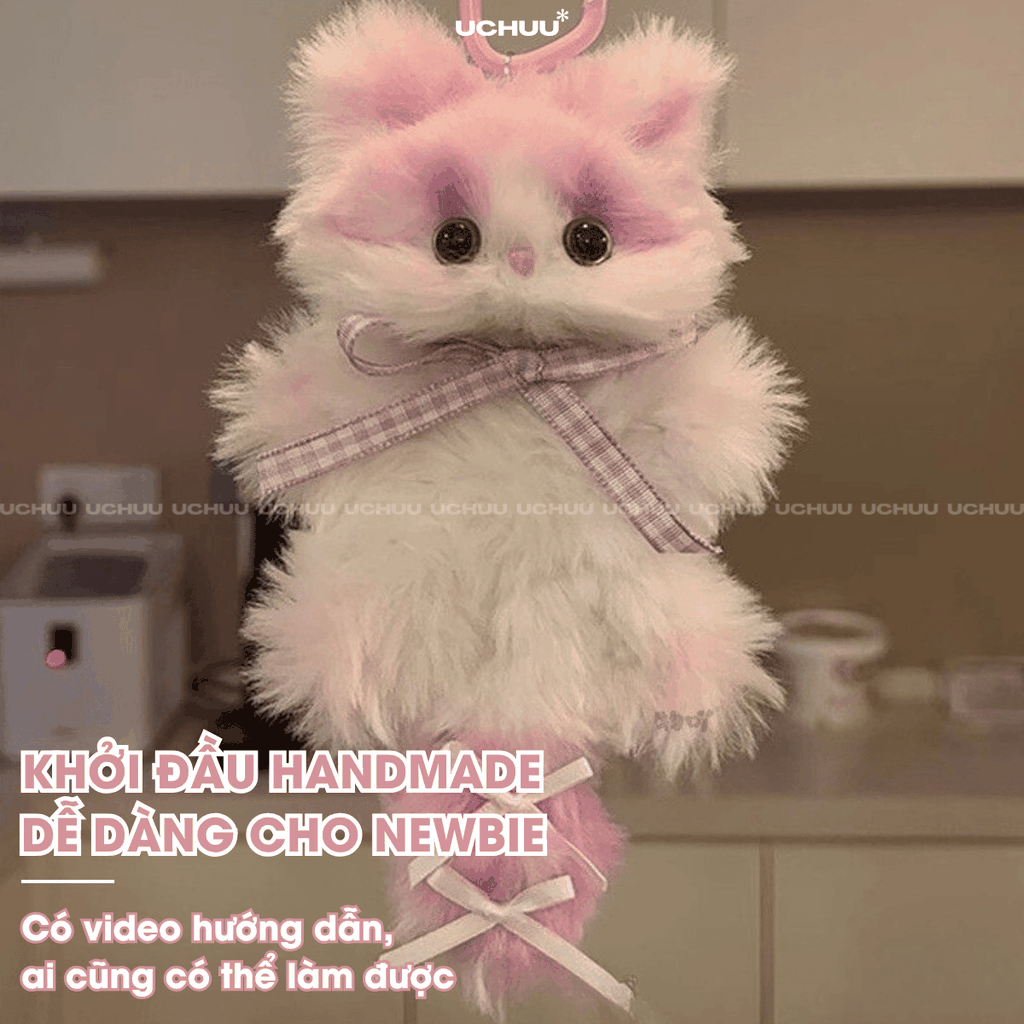 1. Set nguyên liệu đầy đủ giúp bạn tự tay làm nên chiếc móc khóa bé mèo bông siêu dễ thương.