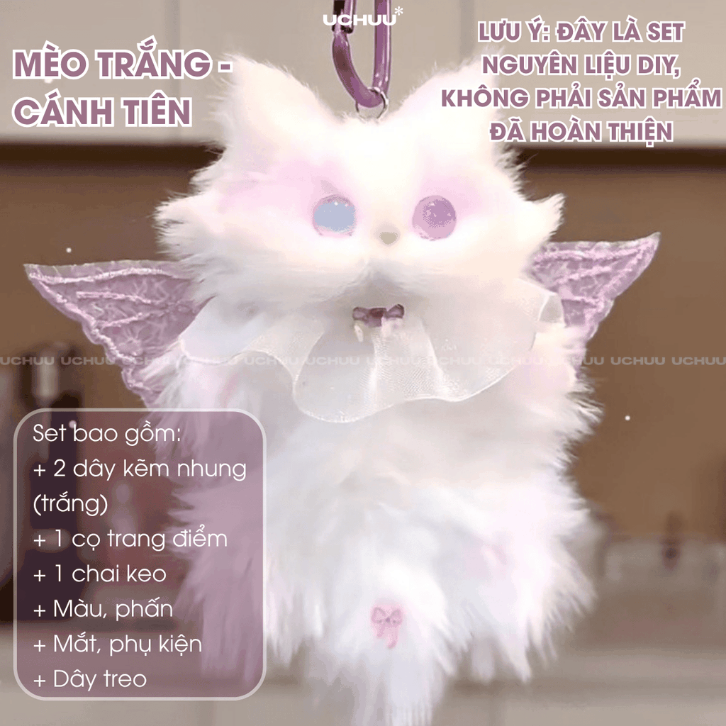- Mỗi set gồm: 2 sợi kẽm nhung trắng; phấn, màu; 1 cọ; 1 keo; mắt; phụ kiện/ charm; dây treo