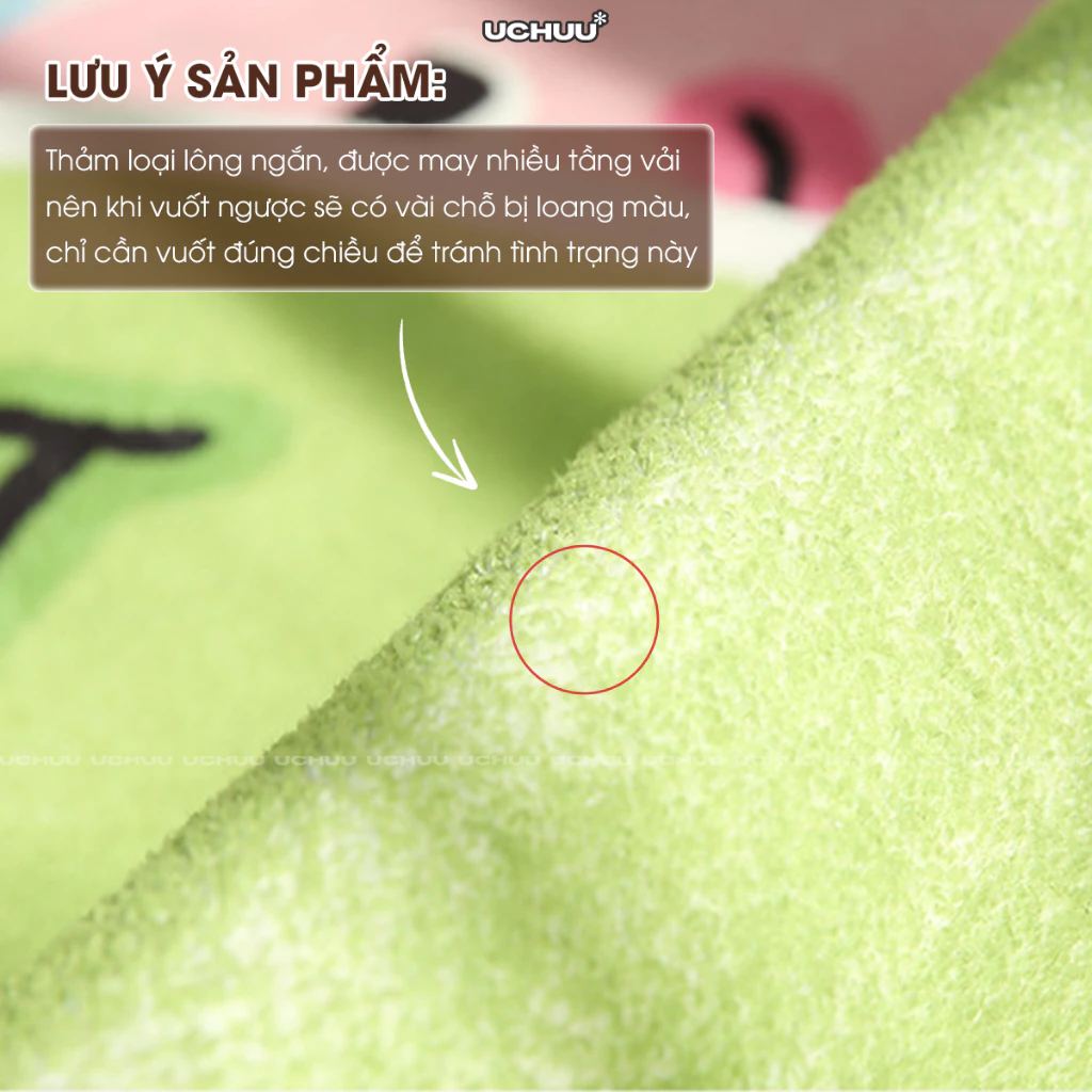 - Đây là loại thảm lông ngắn và được may nhiều tầng vải nên khi vuốt ngược sẽ có vài chỗ bị loang màu, quý khách chỉ cần vuốt đúng chiều để tránh tình trạng này.