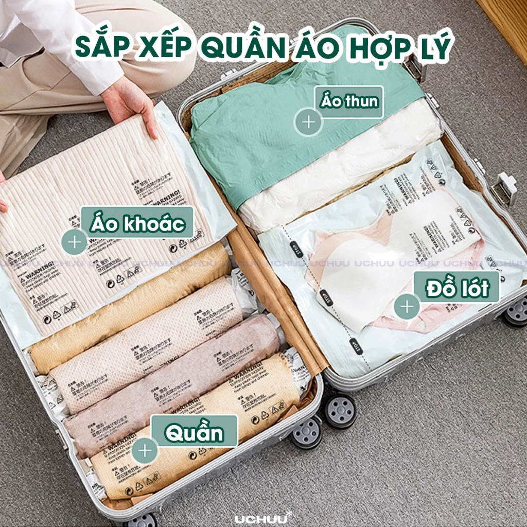 - 1 túi hút chân không đựng quần áo (XS - 40x60cm) không núm van : từ 5-10 áo phông . Khả năng cuộn tròn, Phù hợp để vào vali .